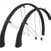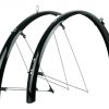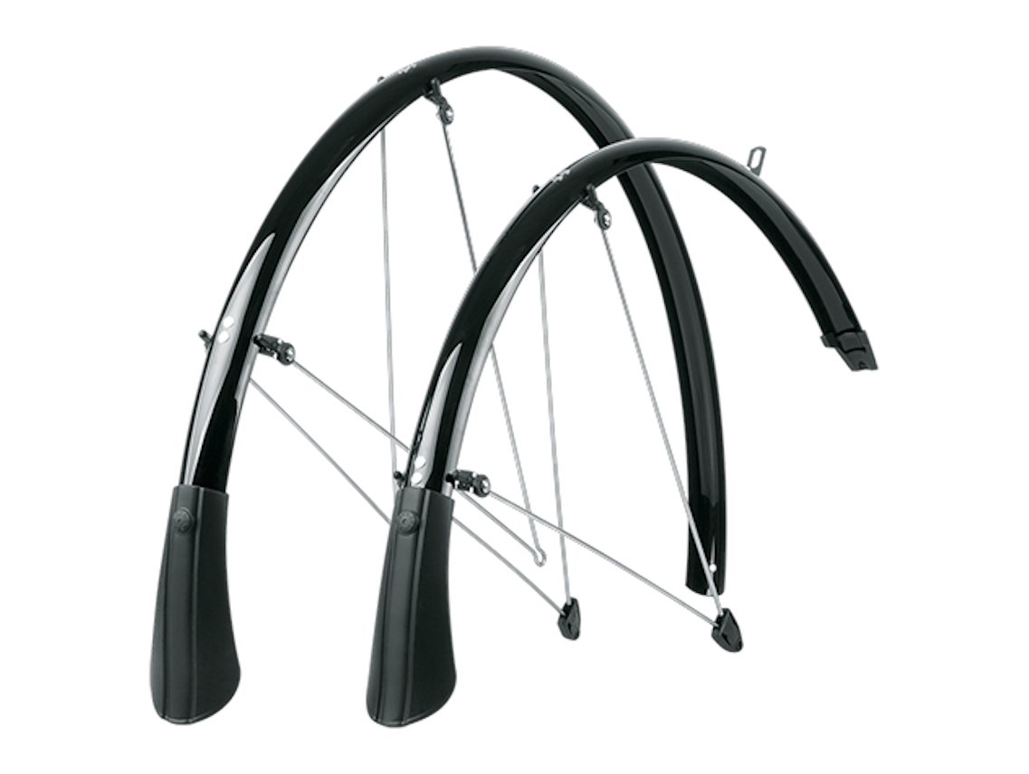With extra long spoilers. The secu clip safety system uncouples the stays should branches become trapped between the mudguard and the front wheel, so that the wheel is unable to jam. Includes a stays kit, stainless steel fixed bridge and mounting material.