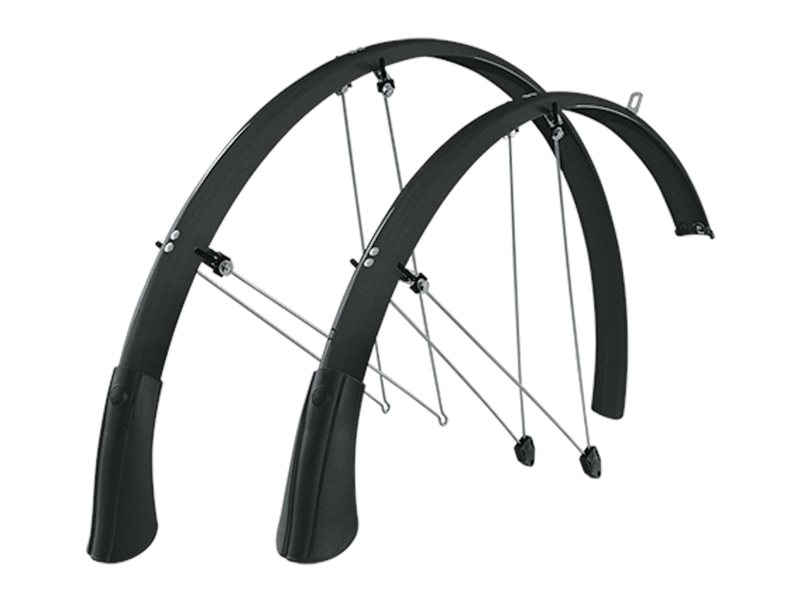 Long, longer, longboard. The SKS Bluemels Longboard mudguard set with extra long spoilers is the perfect companion in any weather. The mud flaps in glossy black are even the longest mudguards with the best protection on the market! Thanks to the flexible sandwich construction, in which ultrafine aluminium strips are embedded in a plastic coating, they are extremely robust, rigid and corrosion-resistant.